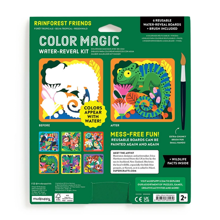 Zestaw Kolorowanka wodna Las deszczowy Mudpuppy to aż 6 plansz z egzotycznymi ilustracjami w intensywnych, przyjaznych dziecku kolorach. Obrazki przedstawiają zwierzęta tropikalne, takie jak tukan, tygrys, kameleon i inne mieszkańce lasu deszczowego, co pobudza ciekawość i zachęca do nauki poprzez zabawę. W komplecie znajduje się wygodny pędzelek do malowania wodą oraz karty z ciekawostkami, które można czytać razem z dzieckiem. Całość jest lekka, kompaktowa i łatwa do przechowywania, a solidny karton gwarantuje trwałość nawet przy częstym użytkowaniu. To produkt, który rośnie razem z dzieckiem, dostarczając inspiracji i radości przez długi czas.