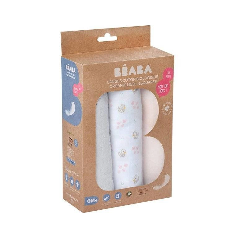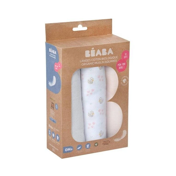 Komplet trzech wielofunkcyjnych muślinowych pieluszek francuskiej marki BEABA o wymiarach 70x70 cm to idealne uzupełnienie linii produktów pielęgnacyjnych. Pieluszki wyróżnia oryginalna kolorystyka: pudrowy róż + biel z multimotywem małego uroczego łabędzia i różowych serduszek + lawendowa szarość. Mogą być używane jako kocyk do utulania i uspokajania, przenośny przewijak, chusta do karmienia piersią i przy odbijaniu po karmieniu, oraz pełnić rolę śliniaka. Doskonale sprawdzą się jako delikatne okrycie do wózka lub siedziska podczas drzemki czy spaceru, jako ochrona przed słońcem i wiatrem, a także po kąpieli. Są przewiewne, chłonne, wyjątkowo miękkie i delikatne dla skóry. Dzięki kompletowi 3 sztuk rodzic ma potrzebną pieluszkę zawsze pod ręką.