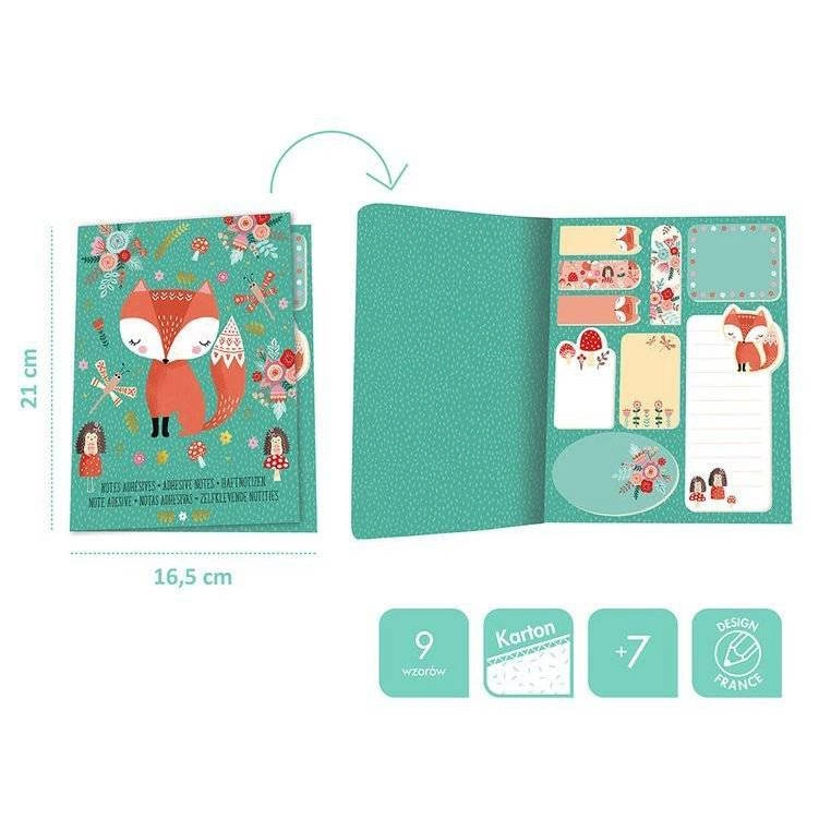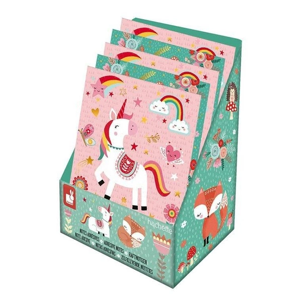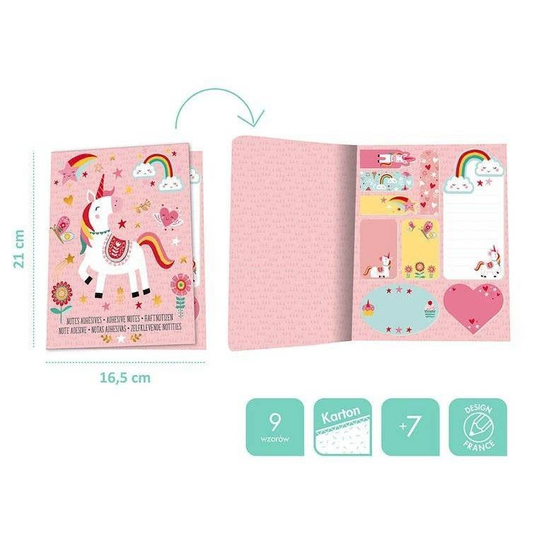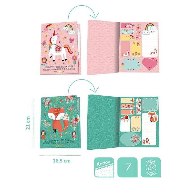 Notes z samoprzylepnymi karteczkami Janod dostępny jest w dwóch wariantach: z motywem jednorożca na różowym tle lub z lisem na tle turkusowym. Oba wzory są równie atrakcyjne i dopasowane do gustów dzieci w wieku szkolnym.