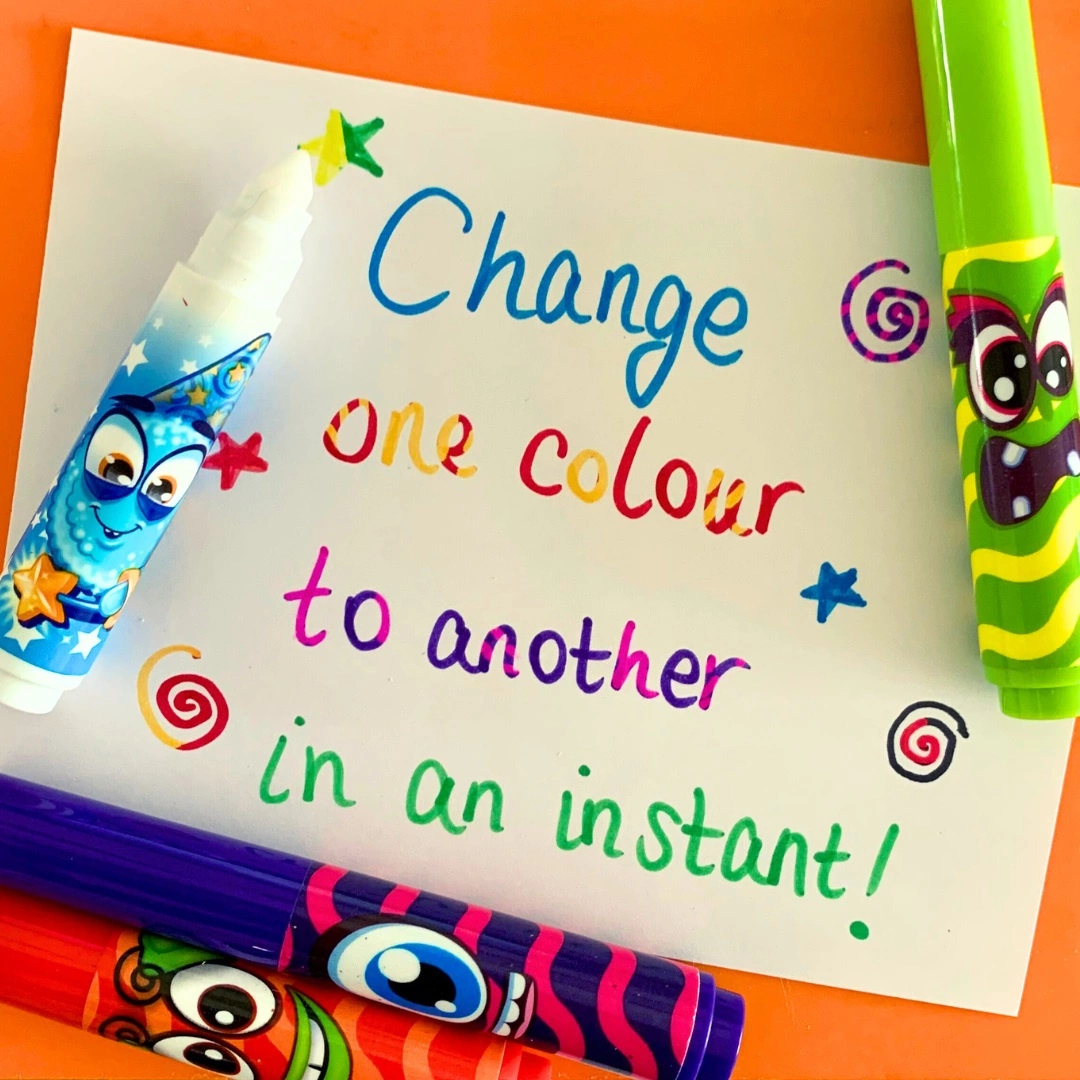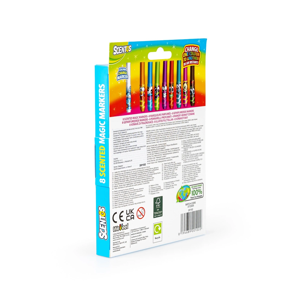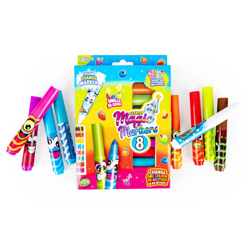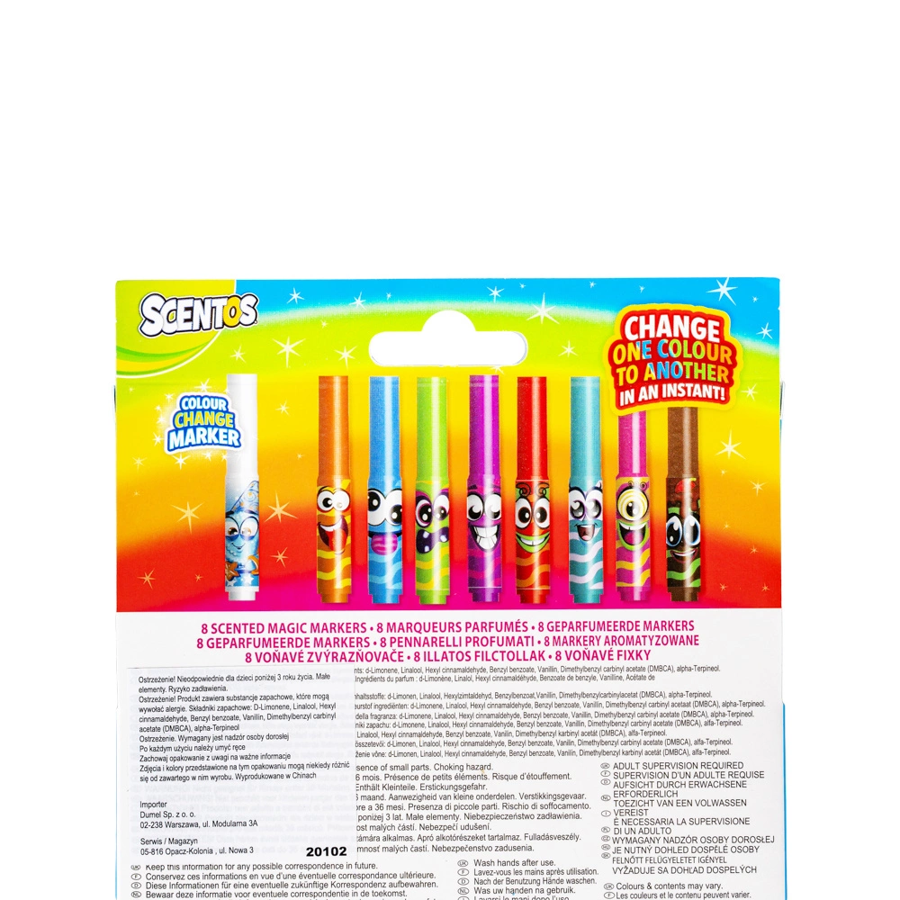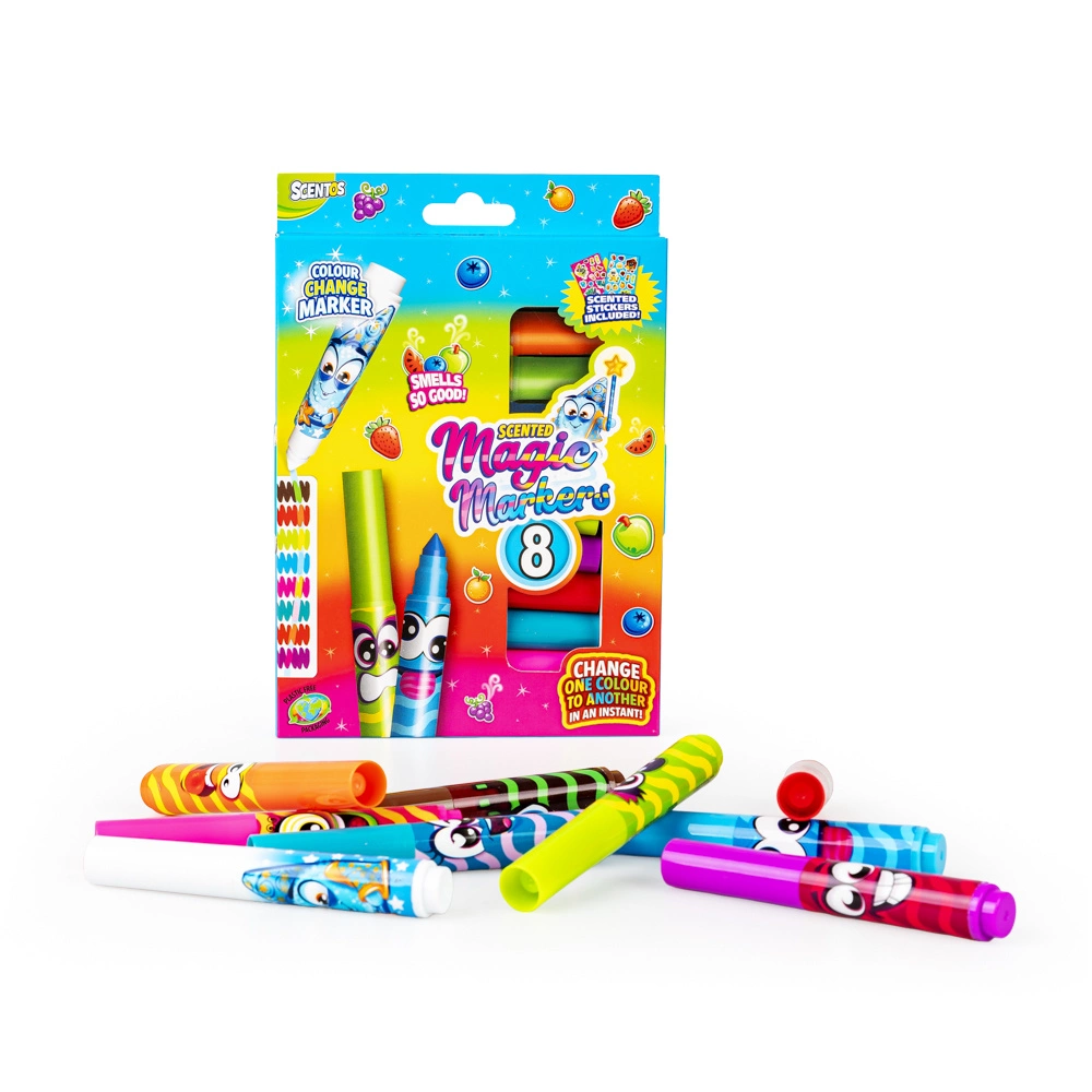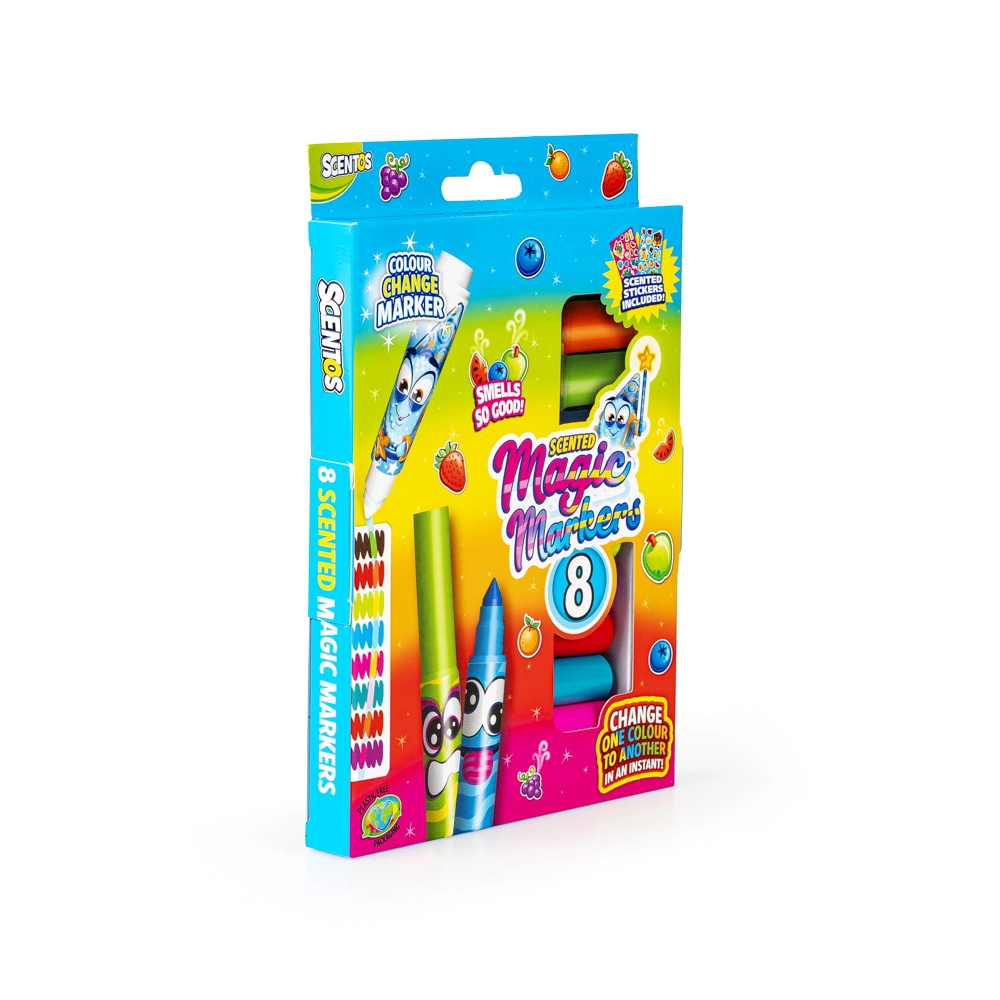 Rysowanie jeszcze nigdy nie było tak pachnące i... magiczne! Ten wyjątkowy zestaw zawiera 8 zapachowych markerówozdobionych wesołymi buźkami. Wśród nich znajduje się prawdziwa niespodzianka – magiczny marker, który potrafi zmieniać kolory pozostałych!