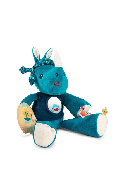 Przytulanka ma wiele funkcji aktywizujących. Prawa łapka nosorożca pełni rolę poręcznego uchwytu i wyposażona jest w drewniany gryzak w kształcie deski do surfowania. Prawa noga szeleści, a na lewej łapce i nóżce znajdują się miękkie naszywki z krabem i rozgwiazdą, które dodatkowo stymulują sensorycznie maluszka.