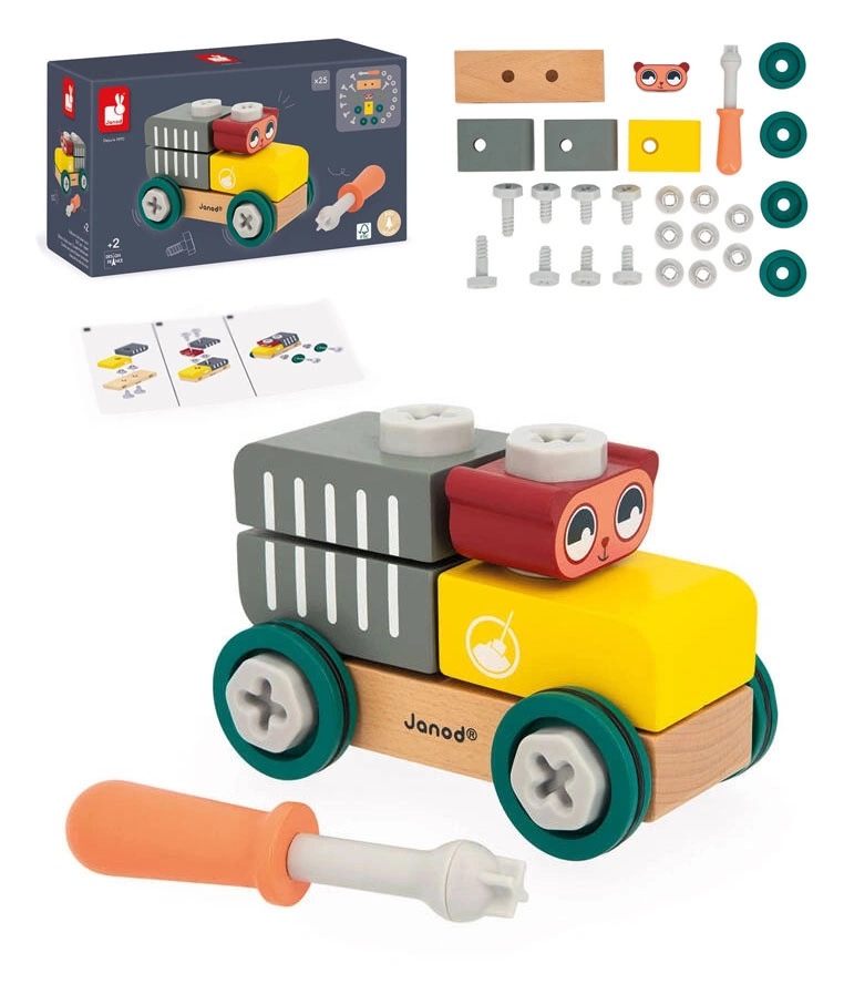 Samochód – cysterna do składania z serii Brico’Kids marki Janod to wyjątkowa drewniana zabawka, która zachwyca kolorowym wzornictwem oraz funkcjonalnością. Zestaw zawiera aż 25 elementów do samodzielnego montażu, w tym śrubki, nakrętki, podkładki, drewnianego misia-kierowcę oraz wygodny śrubokręt. Zabawka została zaprojektowana z myślą o dzieciach od 2 lat, wspierając rozwój poprzez aktywność manualną i kreatywną zabawę. Składanie cysterny to nie tylko sposób na spędzenie czasu w ciszy i skupieniu, ale także okazja do nauki koncentracji, cierpliwości oraz logicznego myślenia. Drewniane elementy są przyjazne dla dłoni dziecka, a żywe kolory zachęcają do zabawy i odkrywania nowych możliwości. Pojazd po złożeniu może stać się bohaterem codziennych historii, co rozwija wyobraźnię i zachęca do samodzielnego tworzenia scenek. Dzięki dołączonej instrukcji, nawet najmłodsi mogą poczuć satysfakcję z własnoręcznego złożenia pojazdu.