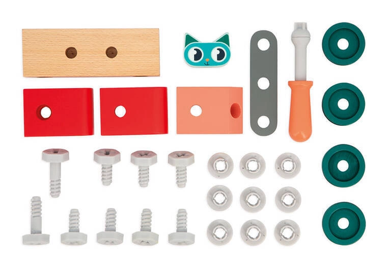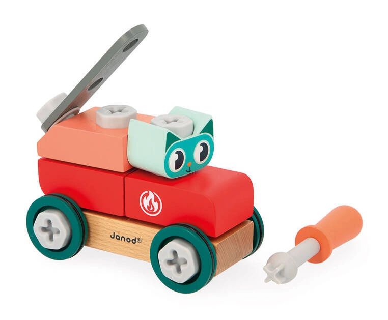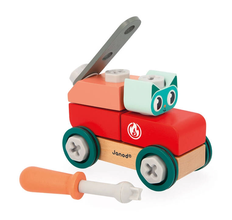 Drewniany wóz strażacki Kot z serii Brico'Kids francuskiej marki JANOD to idealny prezent dla małego majsterkowicza, który przeniesie go w świat strażackich przygód. Zestaw składa się z 27 elementów, w tym części do zbudowania pojazdu, takich jak śrubki i śrubokręt – niezbędne narzędzia do złożenia konstrukcji. Wśród elementów znajduje się również figurka kierowcy-kota, która dodaje zabawie wyjątkowego uroku.