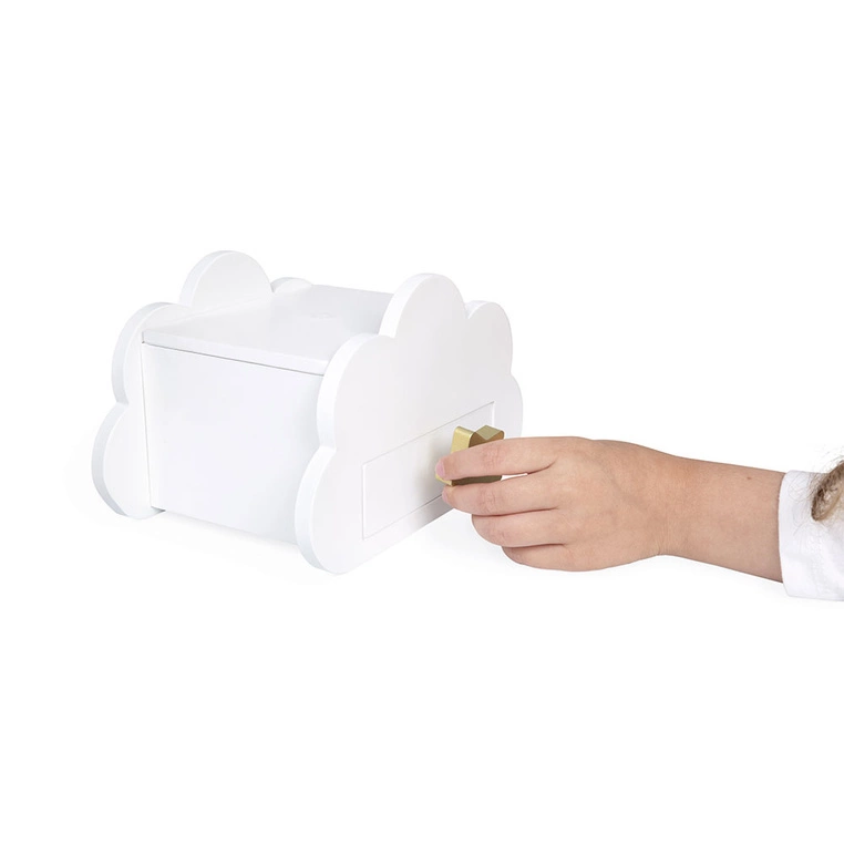 Biała szkatułka Janod w kształcie chmurki z uroczym jednorożcem to połączenie subtelnej elegancji i dziecięcej radości. Wykonana z certyfikowanego drewna FSC, zapewnia trwałość i bezpieczeństwo użytkowania. Delikatne pastelowe barwy i wykończenie wysokiej jakości sprawiają, że produkt doskonale wpisuje się w wystrój dziecięcych wnętrz, zarówno klasycznych, jak i nowoczesnych. Szkatułka wyposażona jest w magnetyczną gwiazdkę do otwierania szufladki, co rozwija motorykę małą i sprawia dziecku wiele radości. Dodatkowo, zestaw zawiera drewniany naszyjnik i bransoletkę z kolorowych koralików, które mogą być pierwszymi elementami własnej kolekcji biżuterii. Tak zaprojektowany produkt daje dziecku możliwość samodzielnego przechowywania, ozdabiania się i kreatywnej zabawy każdego dnia.