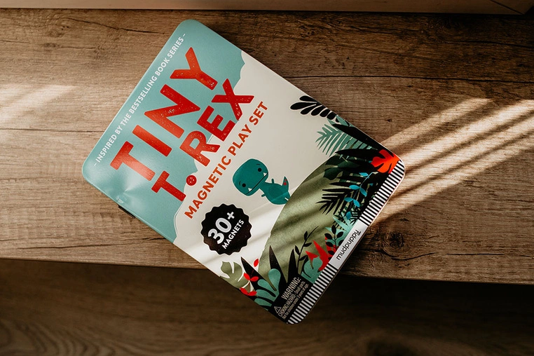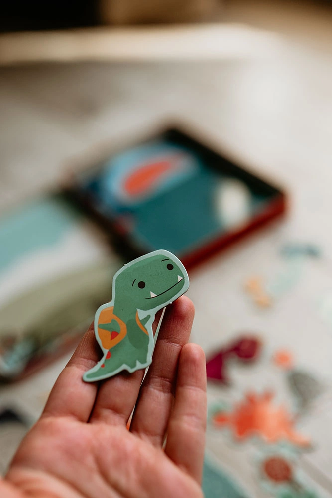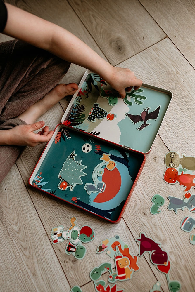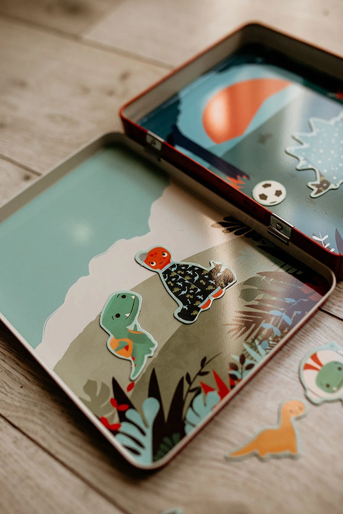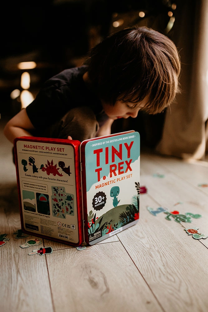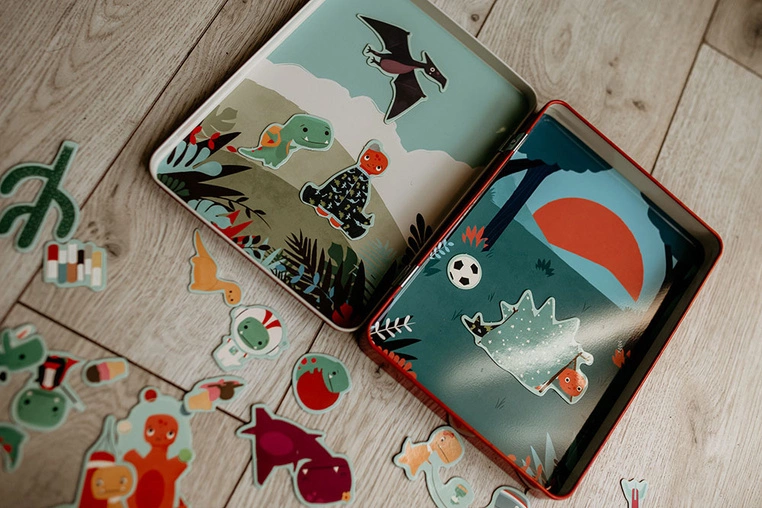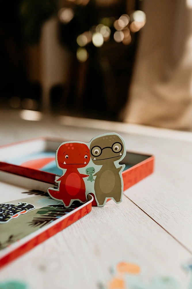 Tablica magnetyczna Tiny T.rex to zabawka magnetyczna o wyjątkowej, kolorowej stylistyce, przyciągającej uwagę zarówno dzieci, jak i dorosłych. Barwne ilustracje dinozaurów oraz prehistorycznego krajobrazu zostały stworzone przez uznanego artystę, co nadaje całości niepowtarzalny charakter. Dzięki ponad 30 różnorodnym magnesom dziecko może tworzyć niezliczone kombinacje scenek, rozwijając przy tym poczucie estetyki i wrażliwość na piękno. Kompaktowe, metalowe pudełko gwarantuje wygodę przechowywania i transportu – wszystko jest uporządkowane i gotowe do zabawy w każdej chwili.