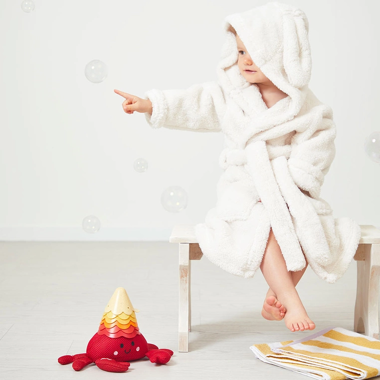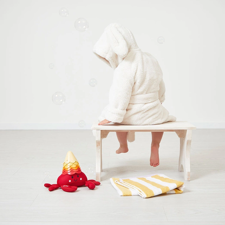 Ten zestaw do kąpieli stworzony został z myślą o najmłodszych, już od 10 miesiąca życia. Duży krab służy jako miękka gąbka do mycia, a muszelki z różnymi otworami inspirują do przelewania wody i tworzenia niezwykłych efektów. Każdy element został zaprojektowany tak, by wspierać naukę przez zabawę – dopasowywanie, układanie, eksperymentowanie z wodą czy budowanie piramidy to nie tylko świetna rozrywka, ale także ćwiczenie sprawności manualnej i logicznego myślenia. Kolory i kształty stymulują rozwój sensoryczny, a naturalne materiały zapewniają bezpieczeństwo podczas użytkowania. To doskonały sposób, by zamienić kąpiel w czas pełen śmiechu, nauki i bliskości.
