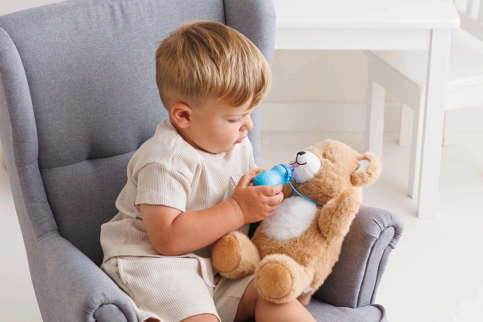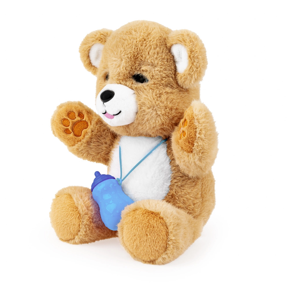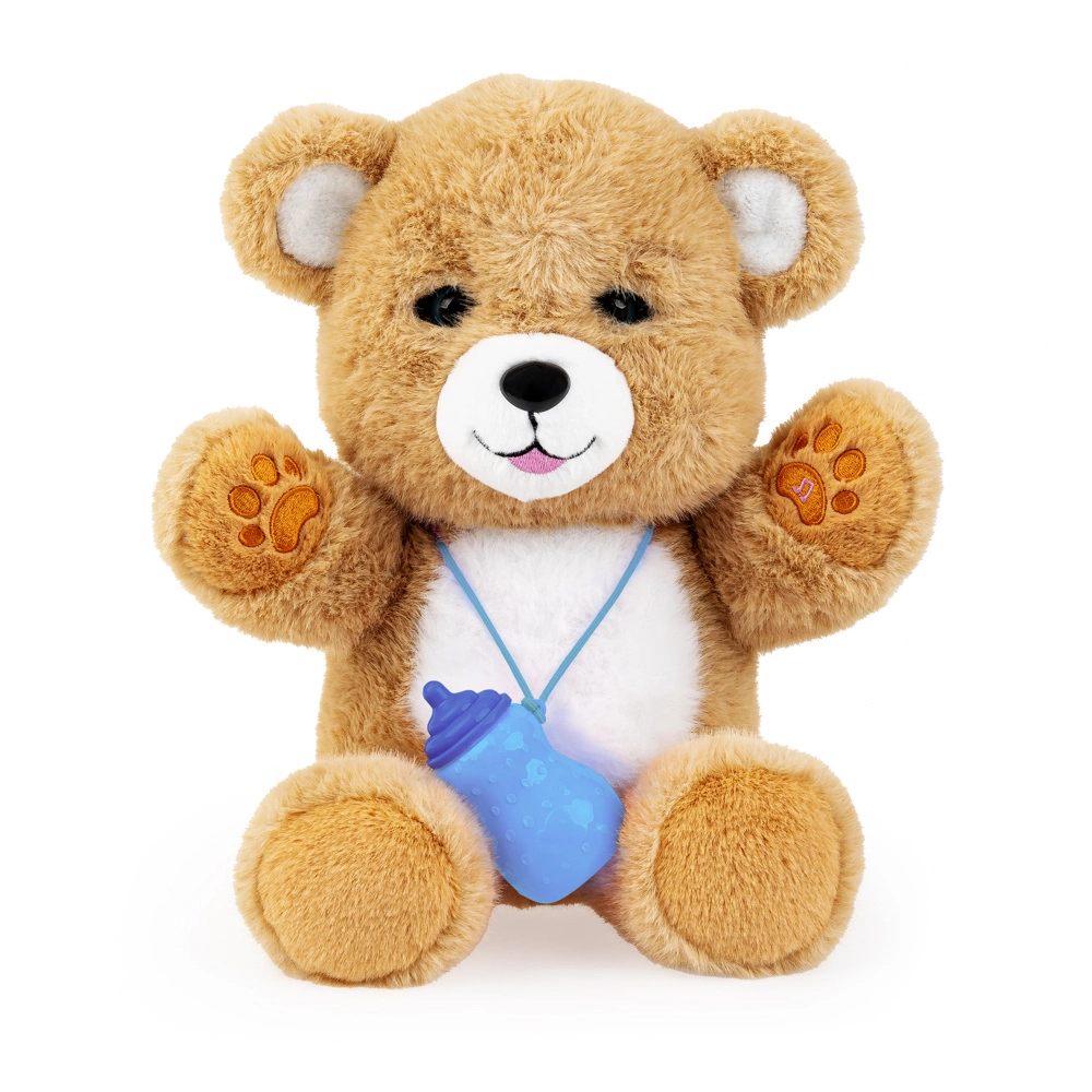 Miś reaguje na czułe gesty – wystarczy pogłaskać go po główce lub brzuszku, by odwdzięczył się słodkimi odgłosami. Dzięki dołączonej buteleczce maluch może „nakarmić” swojego przyjaciela, który dodatkowo otwiera i zamyka oczka, przypominając prawdziwego zwierzaka.