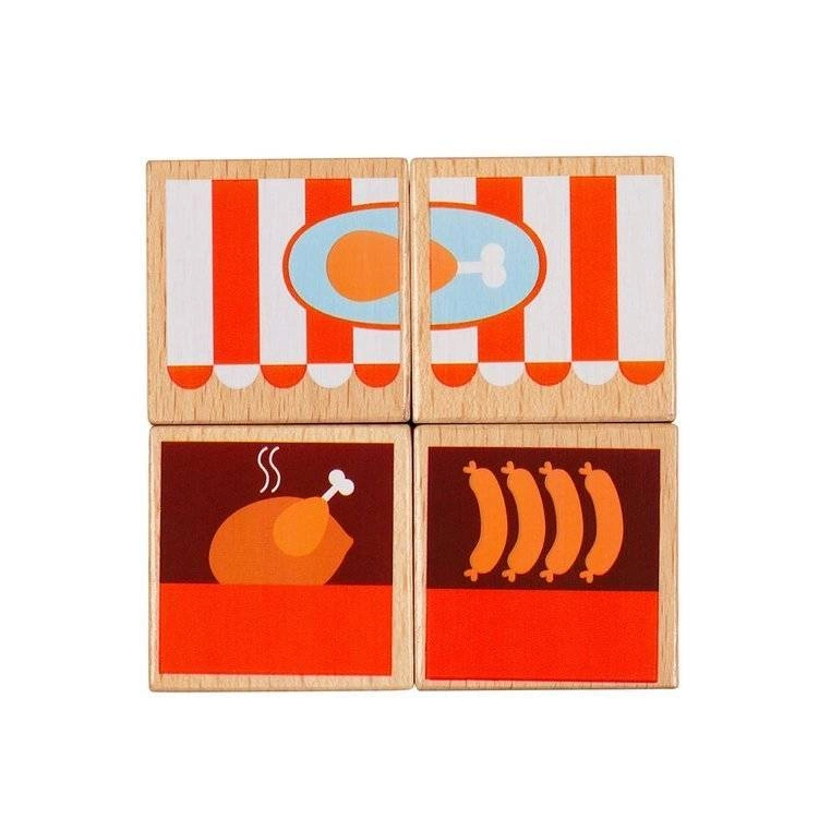 Zestaw składa się z pojazdu-platformy, na której można umieścić kabinę kierowcy oraz cztery klocki-puzzle z grafiką różnych sklepików z jedzeniem: rybnego, mięsnego, warzywniaka i cukierni. Klocki są jednocześnie puzzlami, które należy ułożyć w spójny obrazek. Dwa górne klocki tworzą daszek z logo, a dwa dolne przedstawiają odpowiednie produkty dostępne w danym rodzaju sklepiku.