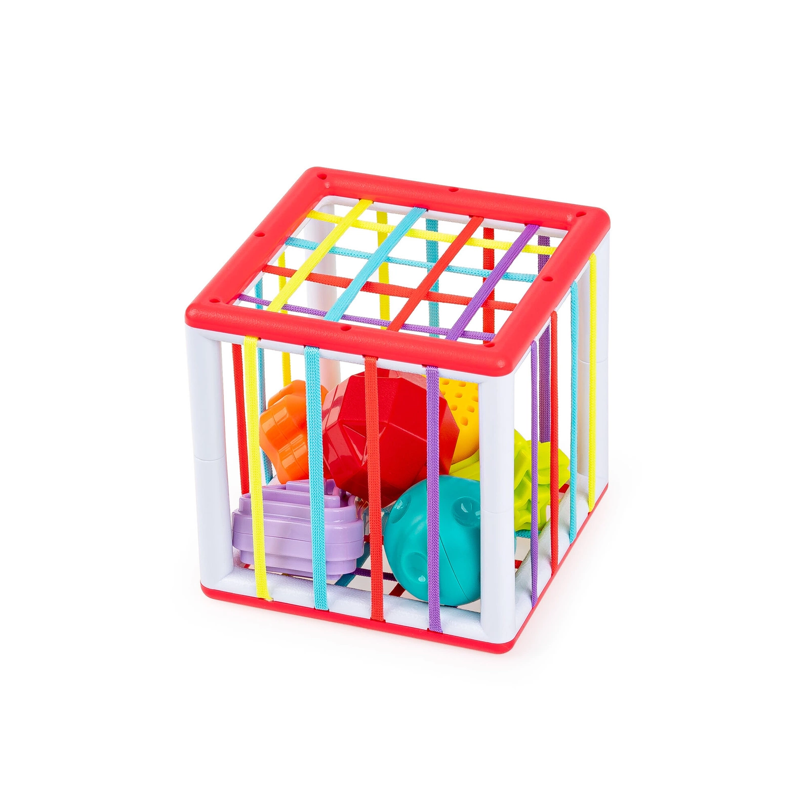 Produkt dostępny jest w jednym uniwersalnym wariancie – zestaw zawiera kostkę z elastycznymi ściankami oraz 6 różnokolorowych klocków o różnych kształtach i fakturach.