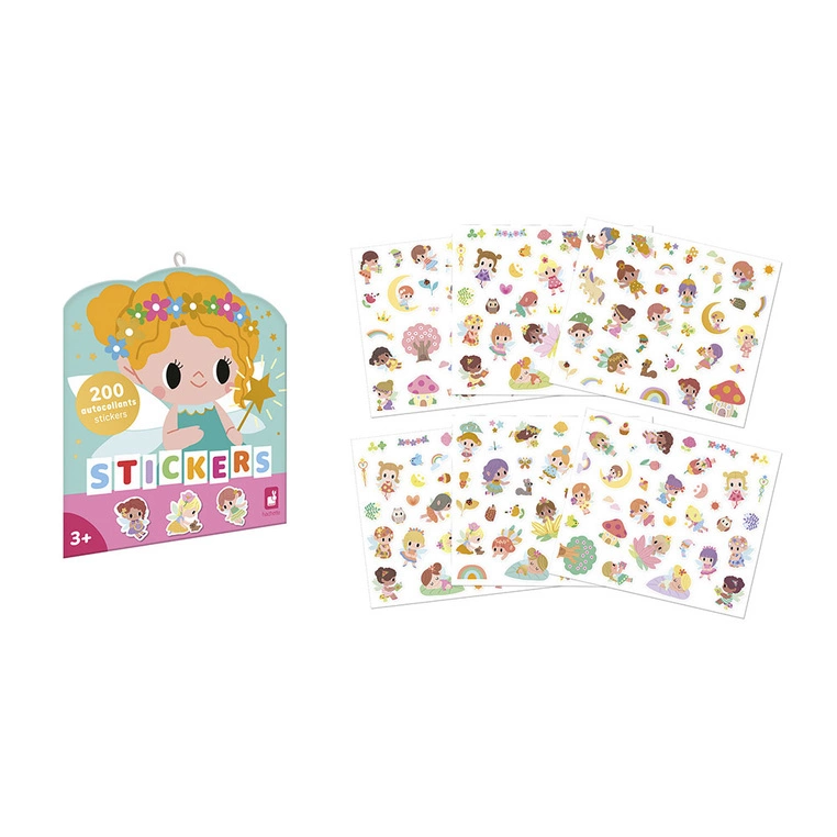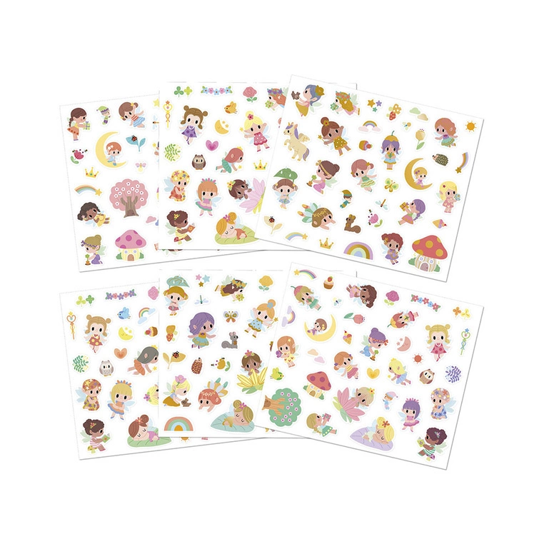 Produkt dostępny jest w wersji z motywem wróżek i bajkowego królestwa. W zestawie znajduje się 6 arkuszy naklejek z różnorodnymi scenkami do tworzenia własnych historii.