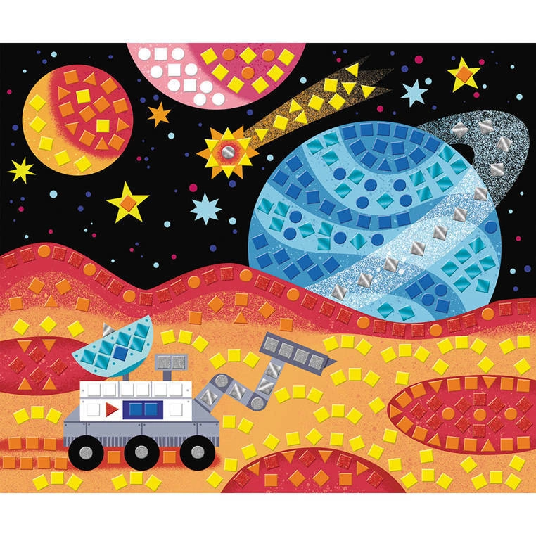 Gotowe obrazki, ozdobione pięknymi mozaikami, staną się wspaniałym elementem dekoracyjnym w dziecięcym pokoju. Dziecko będzie dumne z własnych dzieł i będzie mogło podziwiać kosmiczne pejzaże, które samo stworzyło.
