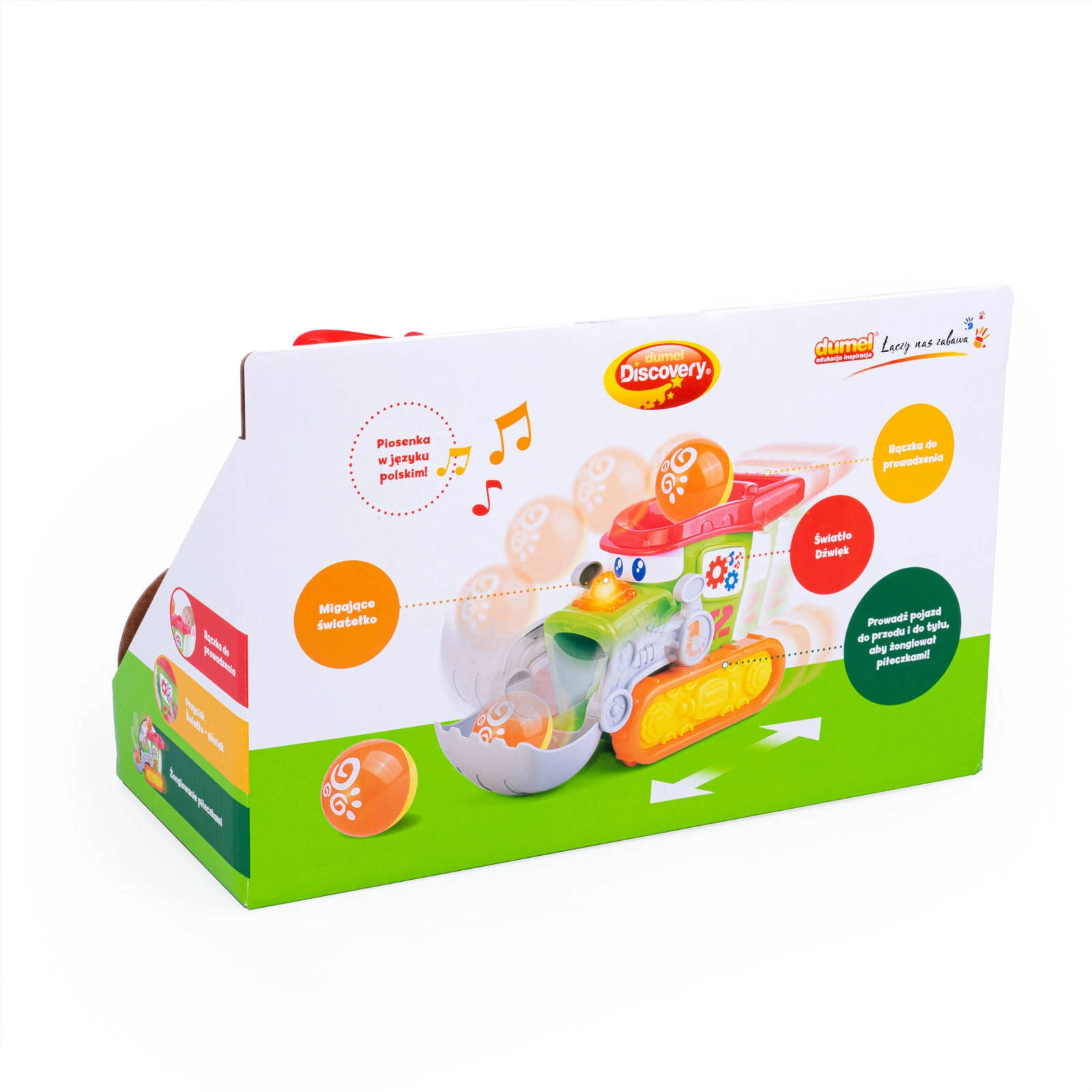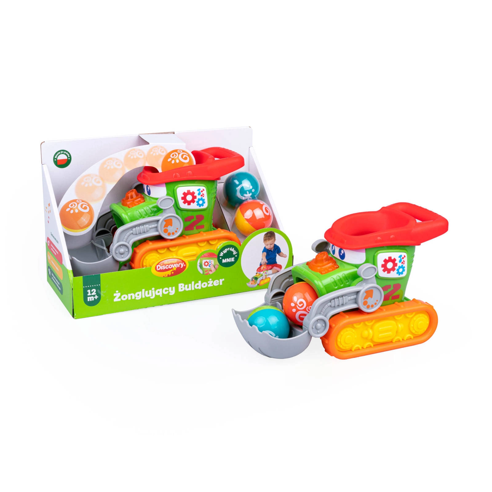 • Interaktywny Żonglujący Buldożer Dumel Discovery dla dzieci od 12 miesięcy – żongluje piłeczkami, mówi i śpiewa po polsku, świeci i rozwija koordynację.